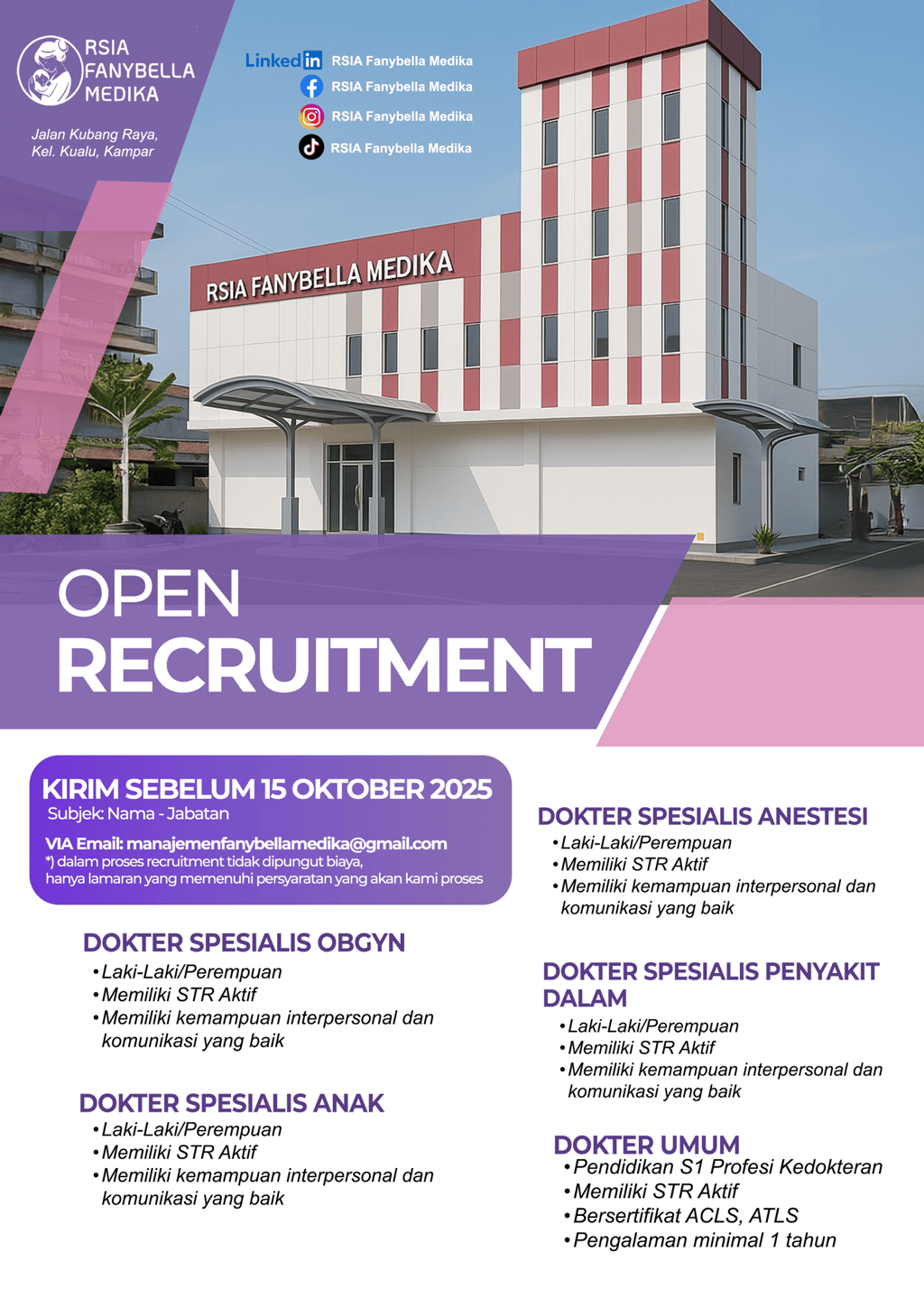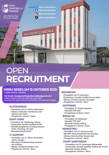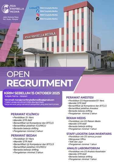Kirim CV anda sebelum 15 Oktober 2025 ke email: manajemenfanybellamedika@gmail.com